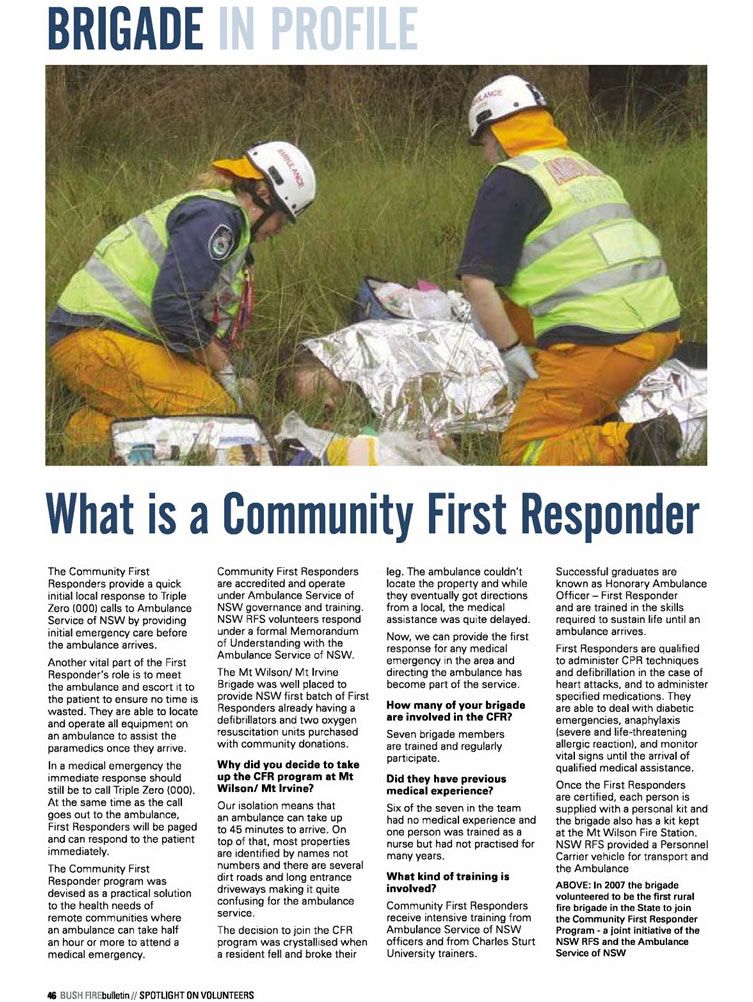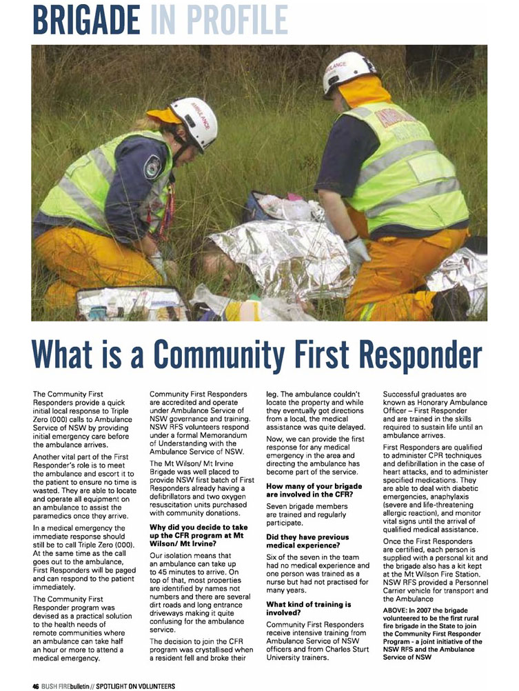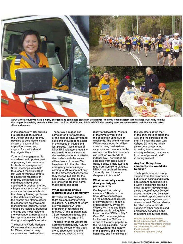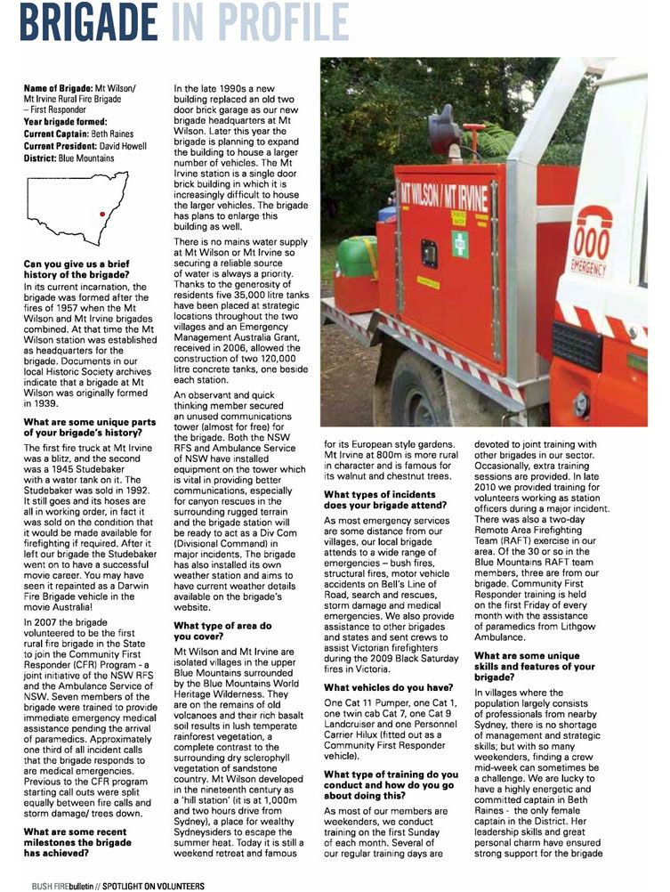 The Mt Wilson/ Mt Irvine Brigade was honoured to be recognised in the July issue of the RFS Bushfire Bulletin with the following stories.