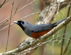 The Black-faced Monarch has a distinctive black face that does not extend across the eyes, grey upperparts, wings and upper breast, contrasting with a rufous (red-orange) belly. The dark eye has a thin black eye ring and a lighter area of pale grey around it. The blue-grey bill has a hooked tip. Young birds are similar but lack the black face, have a black bill and tend to have a brownish body and wings. The Black-faced Monarch is one of the monarch flycatchers, a forest and woodland-dwelling group of small insect-eating birds, and is strictly arboreal (found in trees).