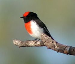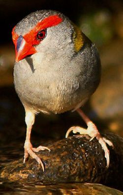 The Red-browed Finch is most easily recognised by its bright red eyebrow, rump and beak, on an otherwise green and grey bird. Upperparts are olive green with grey underneath. Both sexes are similar in appearance. Often observed in small flocks, which feed on the grass. They will fly into dense undergrowth when disturbed by a passer-by. Red-browed Finches may also be called Red-browed Firetails.