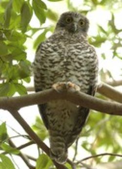 Brown Goshawks are medium-sized raptors (birds of prey). They have a brown head, slate-grey to brown upperparts with a red-brown collar across the upper nape of the neck, and finely barred underparts of red-brown with white. The rounded wings are dark brown to grey above and buff to reddish brown below with darker wingtips, and the long rounded tail is grey with dark bars. The long legs are yellow, with reddish brown feathering about the thighs. The eye is bright yellow. Males are smaller than females. Young birds have grey-brown eyes, with brown, streaky plumage. There are several subspecies, with the northern sub-species, didimus, being generally smaller and paler. The Brown Goshawk is widespread but secretive.