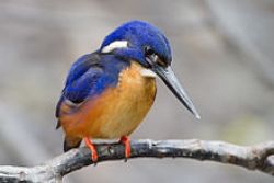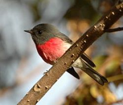 The small Mistletoebird is the only Australian representative of the flowerpecker family, Dicaeidae, and is also known as the Australian Flowerpecker. Males have a glossy blue-black head, wings and upperparts, a bright red throat and chest, a white belly with a central dark streak and a bright red undertail. Females are grey above, white below, with a grey streak on the belly, and a paler red undertail. Young birds resemble females but are paler and have an orange, rather than dark, bill. These birds are swift and erratic fliers, moving singly or in pairs, usually high in or above the canopy.