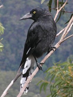 The Pied Currawong is a large, mostly black bird, with a bright yellow eye. Small patches of white are confined to the under tail, the tips and bases of the tail feathers and a small patch towards the tip of each wing (visible in flight). The bill is large and black and the legs are dark grey-black. Both sexes are similar, although the female may sometimes be greyer on the underparts. Young Pied Currawongs are duller and browner than the adults.