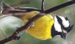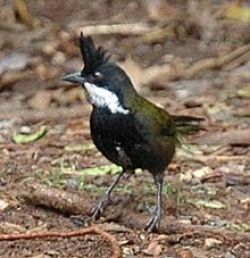 The Crested Shrike-tit is a medium-small bird with a striking black and white striped head and neck, a small crest that is often held flattened over crown, a black throat, and a short heavy bill with hooked tips. It has wide, rounded wings and a square-tipped tail that can appear slightly forked. The species is separated into three geographically isolated subspecies. Males of the Eastern Shike-tit, frontatus, have an olive green back and rump, striking yellow underparts, with grey wings and