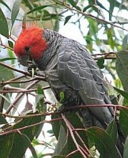The Gang-gang Cockatoo, or Gang Gang for short, is a small, stocky cockatoo with a wispy crest, large, broad wings and a short tail. The adult male has a distinctive scarlet red head and crest, with the rest of the body slate-grey. The adult female has a dark grey head and crest, with the feathers of the underparts edged pink and yellow. In both sexes, the feathers of the upperparts and wings are faintly edged pale-grey, giving a barred appearance, with females having additional yellow edging to their feathers that increases this barred effect. Young birds are similar to the adult female, with young males differing by having a red crown and forehead and a shorter, less twisted red crest. Gang-gangs are gregarious but relatively quiet cockatoos, and may usually be located in food trees by the sounds of feeding and falling debris.