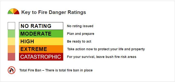 - The NSW Rural Fire Service website provides the latest information on current bushfires in NSW as well as tips on travelling, camping, bushwalking and caravanning during the bushfire season. Check to see what the Fire Danger Rating is and if there is a Total Fire Ban (TOBAN).